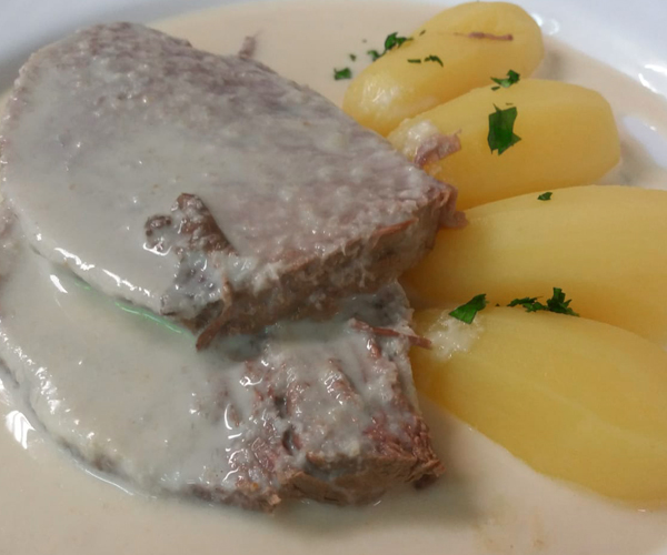 vom Rind mit Kartoffelklößen und Apfelkompott oder Rotkohl
